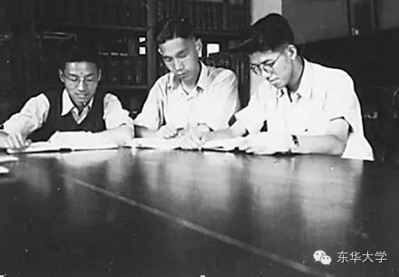 ▲1948年,郁銘芳(中)與大學同學于文潮(左)、郎慶海(右)在上海圣約翰大學圖書館學習