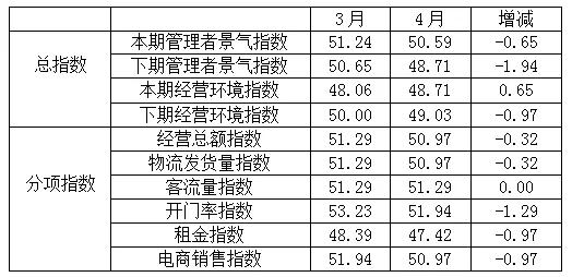 分項指數中,經營總額指數為50.97,比3月的51.29下降0.32個百分點;物流發貨量指數為50.97,比3月的51.29下降0.32個百分點;客流量指數為51.29,與3月持平;開門率指數為51.94,比3月的53.23下降1.29個百分點;租金指數為47.42,比3月的48.39下降0.97個百分點;電商銷售指數為50.97,比3月的51.94下降0.97個百分點。