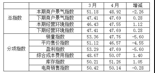 分項指數中,銷量指數為47.76,比3月的53.36下降5.60個百分點;平均售價指數為46.57,比3月的51.12下降4.55個百分點;盈利指數為47.69,比3月的53.29下降5.60個百分點;綜合成本費用指數為50.07,比3月的48.67上升1.40個百分點;庫存指數為51.26,比3月的50.21上升1.05個百分點;電商銷售指數為50.14,比3月的50.42下降0.28個百分點。