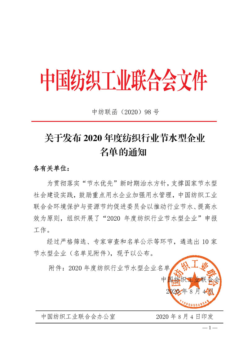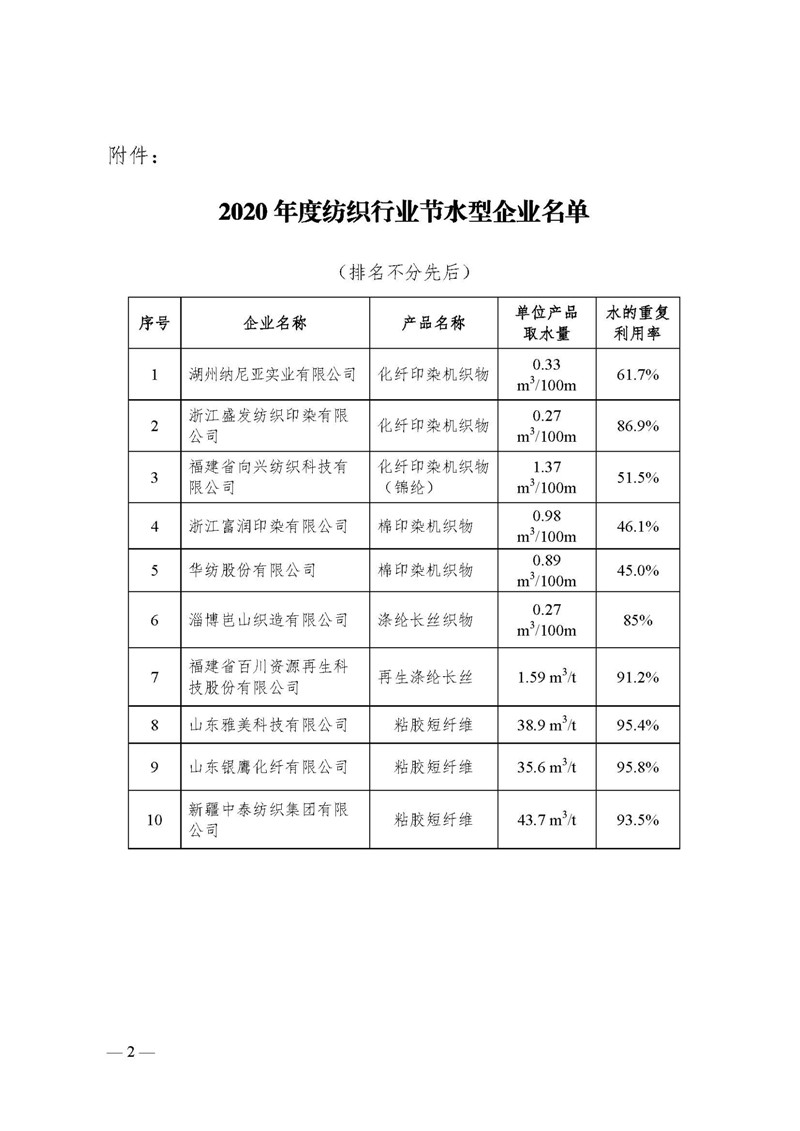 中國紡聯發布2020年度紡織行業節水型企業名單,湖州納尼亞等10家上榜