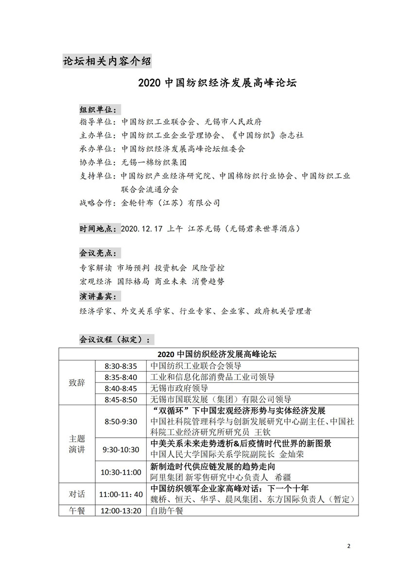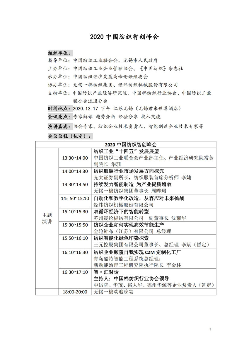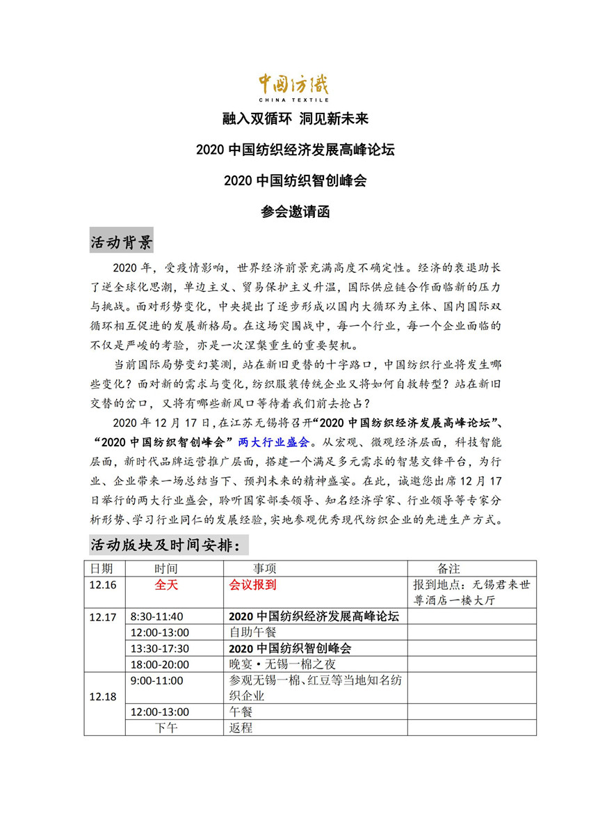 兩大盛會同期舉辦,2020中國紡織經濟發展高峰論壇、2020中國紡織智創峰會與你有約