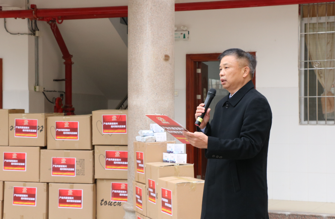 樂昌市民政局局長陳嘉強致辭,感謝曾悅副鎮長率領的大朗毛織一行為樂昌帶來的濃濃暖意。