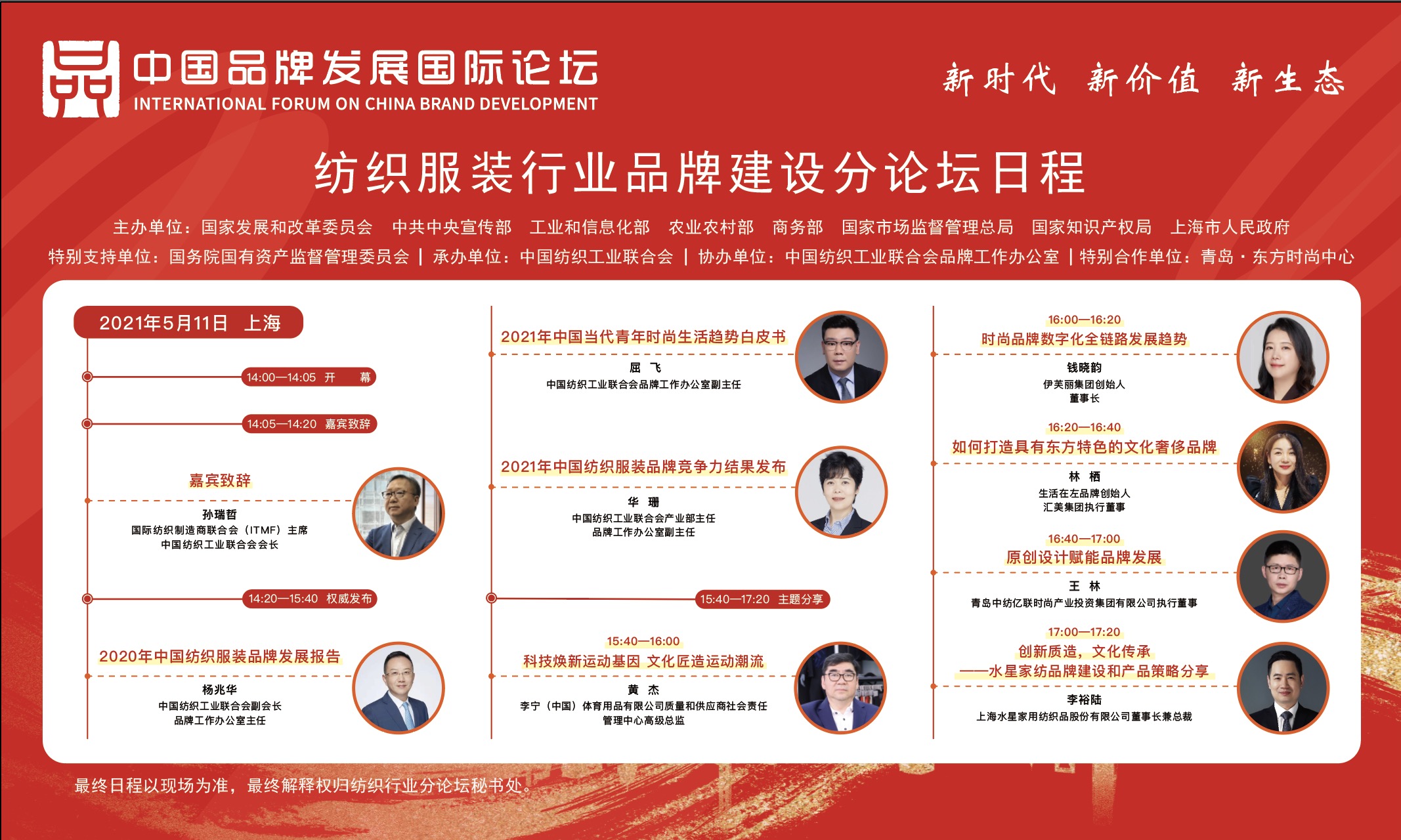 “2021中國品牌發展國際論壇--紡織服裝行業品牌建設分論壇”以“新時代 新價值 新生態”為主題,設置“權威發布”“主題分享”兩大環節。屆時將以線下線上相結合的模式,向全社會展示新時代中國紡織服裝品牌建設的新成就、新面貌,增強公眾對自主品牌的認識與文化自信。屆時,來自國家有關部委、行業協會、品牌企業、新聞媒體等各界代表將齊聚一堂,共話中國紡織服裝品牌發展新貌。