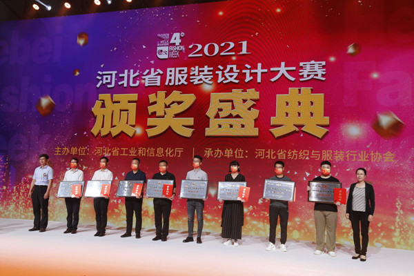 開幕盛典現場,宣布了2021年度河北省服裝設計大賽獲獎名單,并為獲獎設計師頒獎。設計師陳偉平獲2021年度河北省服裝設計大賽金獎,周亞妮、王超獲銀獎,王文澤、劉東、薛穎獲銅獎 。“尤嘉”、“月上”等8家企業品牌獲評“2021年度河北服裝服飾暢銷品牌”,河北格雷服裝股份有限公司、河北泰興羊絨紡織有限公司等8家企業獲評“2021年度河北服裝服飾優質制造商”。