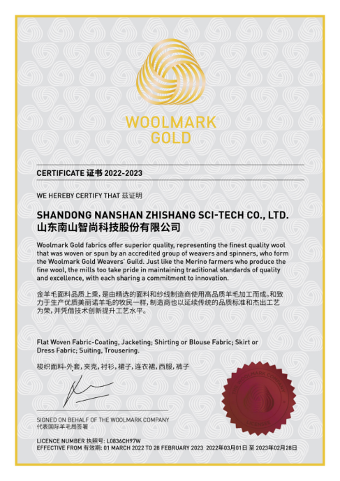 近日,南山智尚榮獲由國際羊毛權威機構The Woolmark Company授予的金羊毛標志(Woolmark Gold)認證,以表彰南山智尚在精紡羊毛面料生產領域的卓越貢獻。