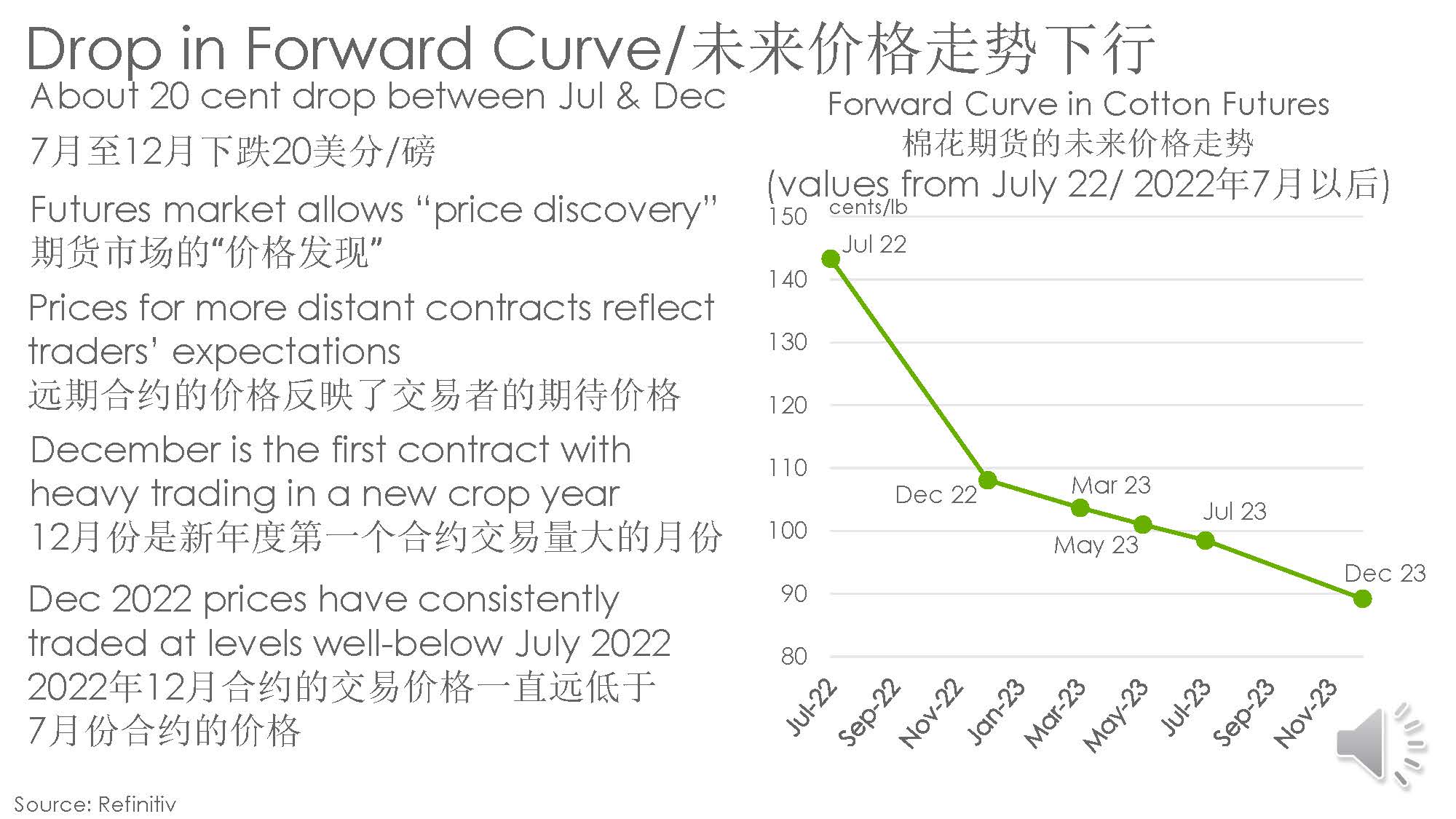 “近期棉價的波動不僅限于棉花市場,而是包括棉花、大豆、小麥、銅和布倫特原油等大宗商品板塊整體下降所致。這也表明投資者對整體市場的信心發(fā)生了巨大變化。通貨膨脹的影響、經(jīng)濟刺激措施的推出、利率上升以及對可能出現(xiàn)的衰退的擔(dān)憂,都將成為投機性押注逆轉(zhuǎn)的原因,也成為價格下跌的原因。”林蓓認(rèn)為,盡管宏觀經(jīng)濟環(huán)境將繼續(xù)對大宗商品價格施壓,但棉花市場也有其特有的支撐力。美國作為全球最大的棉花出口國,西德克薩斯州的嚴(yán)重干旱使美國棉花產(chǎn)量減少,2022/23年度美棉供應(yīng)量有可能受到一定程度的影響,這可能會對未來國際棉價有所幫助。