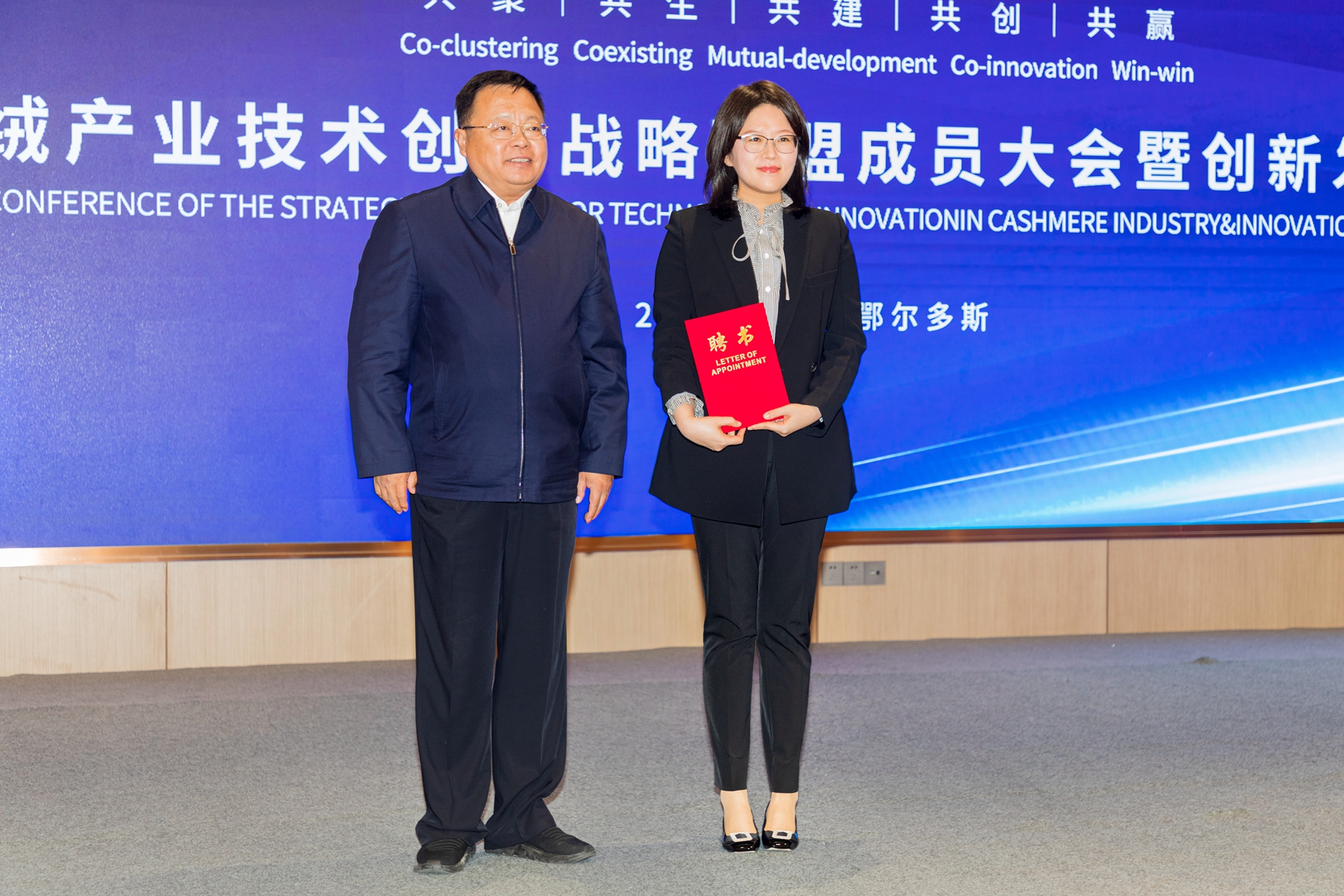 鄂爾多斯高新技術(shù)產(chǎn)業(yè)開發(fā)區(qū)黨工委副書記、管委會主任張鵬程為王臻頒發(fā)羊絨產(chǎn)業(yè)技術(shù)創(chuàng)新戰(zhàn)略聯(lián)盟理事長聘書。