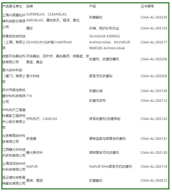在這次發(fā)布會中,包括南京禾素時代抗菌材料科技有限公司、珠海鑫康源新材料科技有限公司、泉州市隱形盾鞋服科技有限公司、同曦集團有限公司等紡織企業(yè)的產(chǎn)品,成為CIAA發(fā)布的2022年度抗菌標志產(chǎn)品。晉大納米科技(廈門)有限公司、連云港杜鐘新奧神氨綸有限公司、北京崇高納米科技有限公司、上海興諾康綸纖維科技股份有限公司等紡織企業(yè)成為CIAA發(fā)布的2022年度合格抗菌材料供應商。