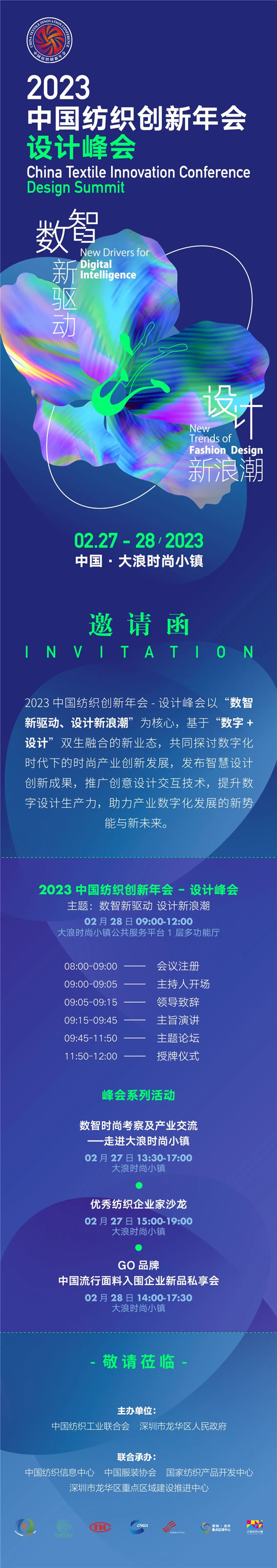 “數(shù)智新驅(qū)動(dòng),設(shè)計(jì)新浪潮”。2月27日-28日,2023中國(guó)紡織創(chuàng)新年會(huì)·設(shè)計(jì)峰會(huì)再度牽手深圳市龍華區(qū)大浪時(shí)尚小鎮(zhèn),發(fā)布智慧設(shè)計(jì)創(chuàng)新成果,推廣創(chuàng)意設(shè)計(jì)交互技術(shù),共同探討中國(guó)紡織行業(yè)先進(jìn)數(shù)字技術(shù)與時(shí)尚創(chuàng)意設(shè)計(jì)跨界融合的新業(yè)態(tài)與新價(jià)值,探尋產(chǎn)業(yè)數(shù)字化發(fā)展的美好新未來。