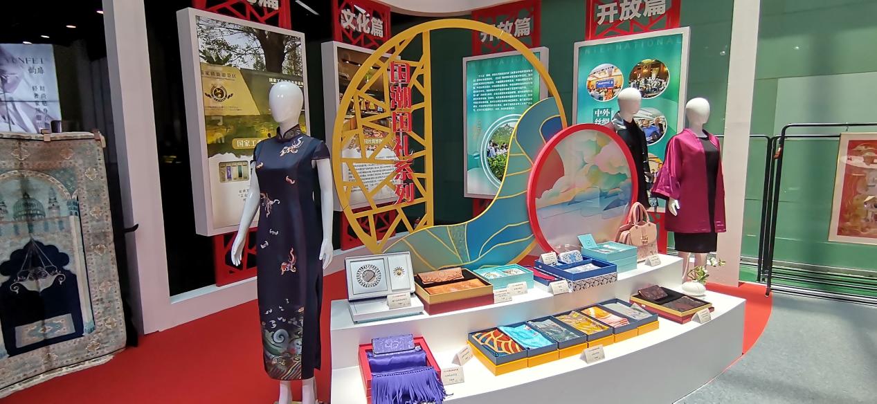 中國絲綢宣傳展面積300平方米,展位整體造型恢弘大氣。精心打造的“天然原料”、“時尚衣裝”、“品質(zhì)生活”、“國禮國潮”四個主題區(qū),匯集了來自浙江、江蘇、四川、重慶、上海等12個省市、38家絲綢品牌企業(yè)的200余件最具代表性的最新產(chǎn)品。